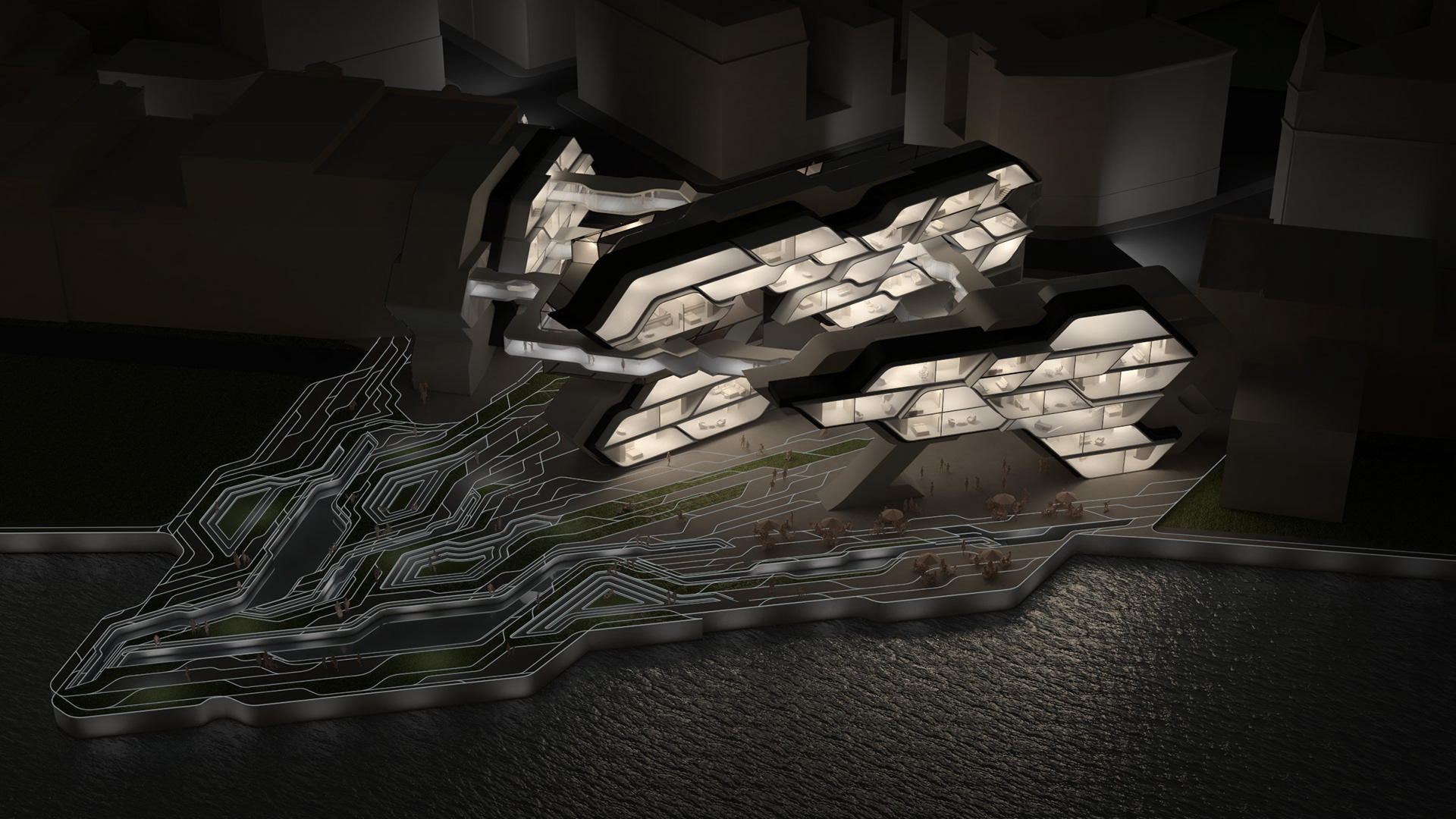 Created with the themes of automation, motion, and continuity in mind, Polaris reenvisions the traditional library concept for the 21st century. Using a network of tracks to deliver books from a storage facility to patrons in a lobby space below, the advanced design emphasizes the technological transformation of libraries into efficient centers of innovation and social interaction. Meanwhile, the residential units are optimized to offer every apartment both a picturesque river view and accessible community spaces for socialization.